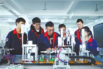 ③云南机电职业技术学院学生做机电一体化项目实训。