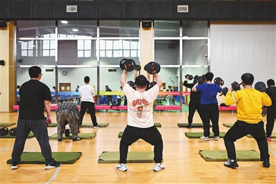 3月21日,在中国农业大学东校区,学生在减脂课上进行力量训练。