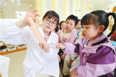 4月7日,在浙江省湖州市德清县三桥幼儿园,德清县中医院医生给孩子讲解中医针灸穴位知识。