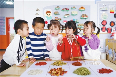 4月7日,河北省唐山市丰南区岔河镇中心幼儿园小朋友学习辨识中药材。新华社发(李秀清 摄)