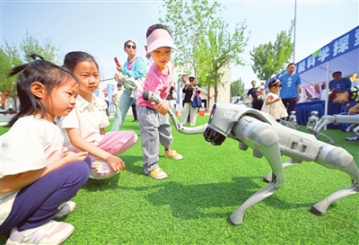 昨日,河西区第39届科技周主场活动举行。图为很多前来观赛的小朋友对机器狗产生了兴趣。