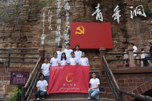 图为实践团成员在红旗渠青年洞前合影。陈雨欣供图