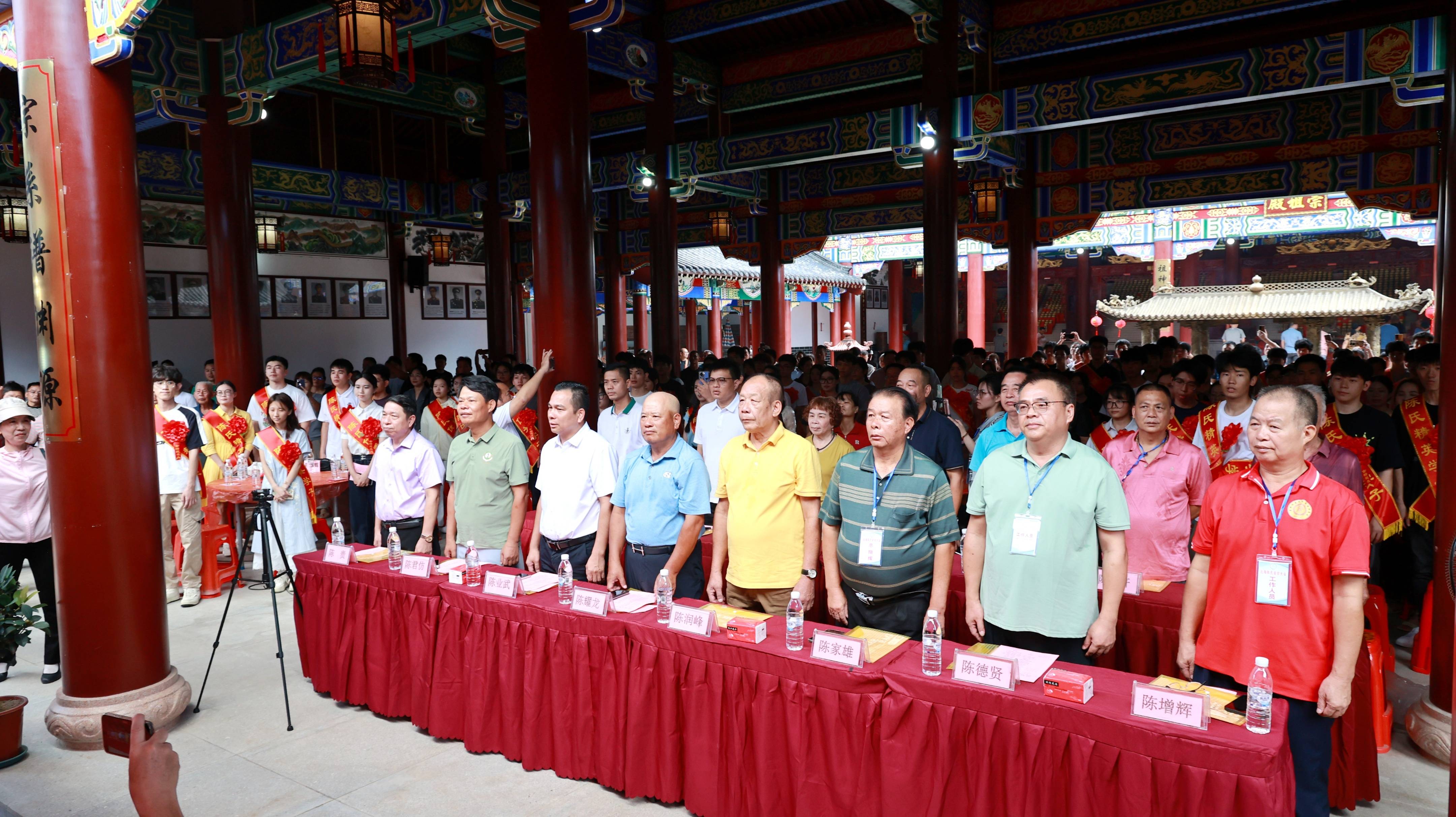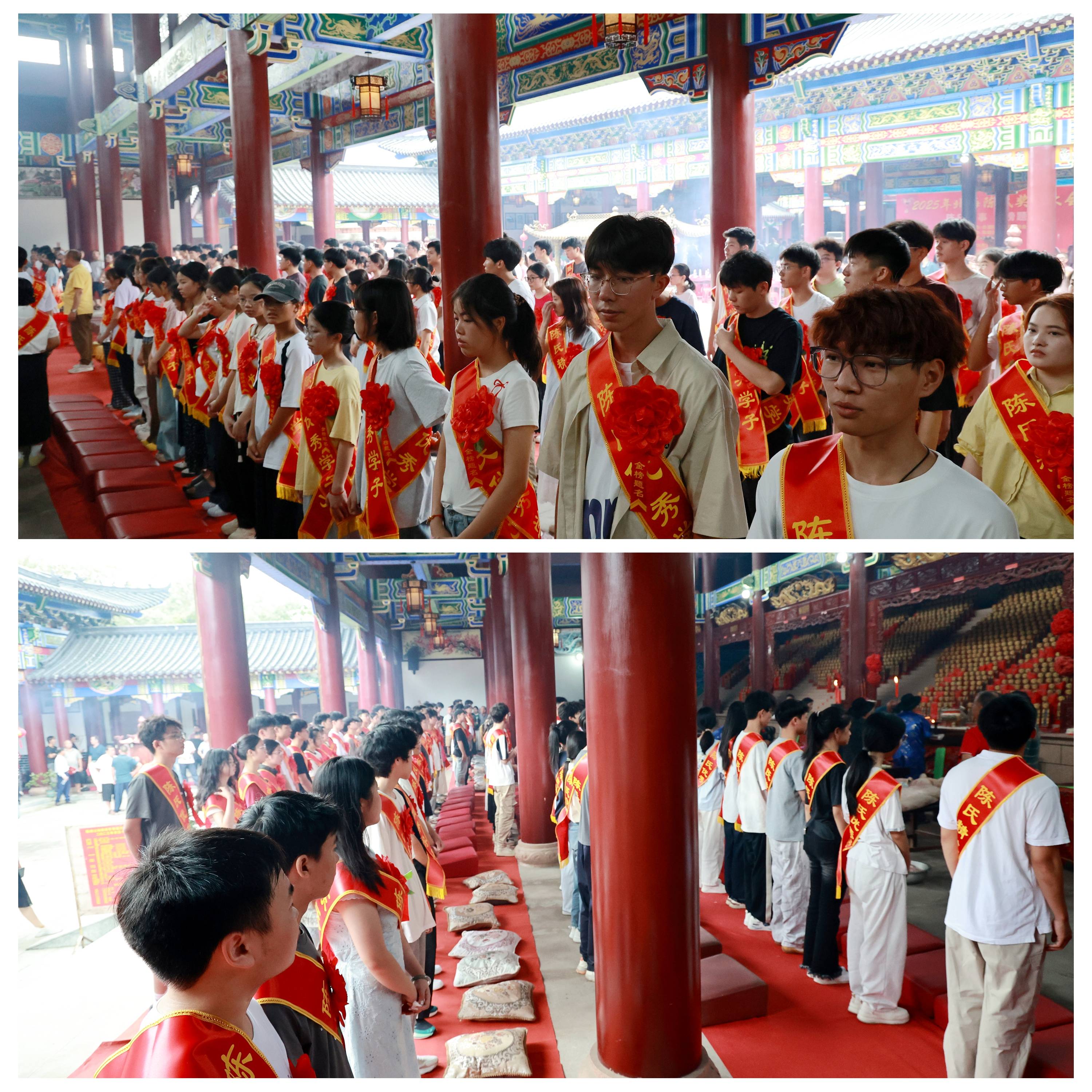 奖学大会前,一场庄重的祭祖仪式拉开帷幕。随着10:30分的钟声悠扬响起,合浦陈氏奖学促进会副秘书长陈锡安宣布祭祀正式开始。在锣鼓喧天的欢声中,136位金榜题名的北海陈氏学子,胸戴“金榜题名”红花,肩披“陈氏优秀学子”“陈氏精英学子”红绸,列队庄重地步入祠堂。路程较远的玉林、钦州、南宁等地宗亲们也纷纷赶来,神情肃穆地聚集在祭祀厅,共同见证这一盛事。