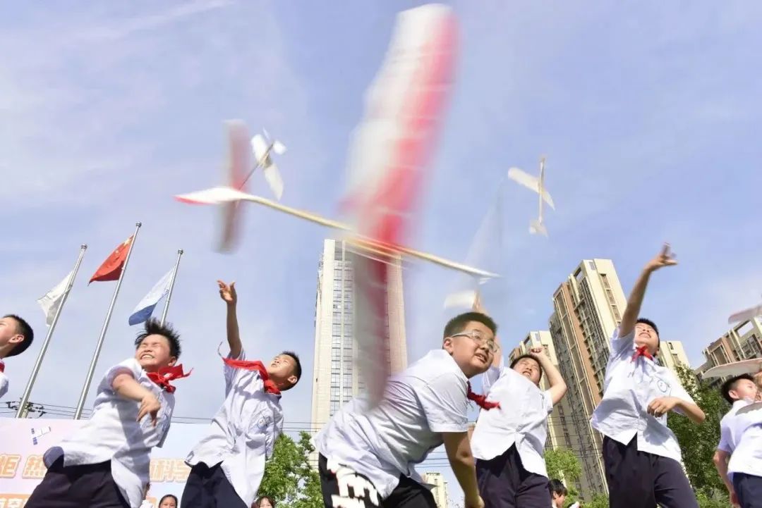 6月8日,在合肥市南岗小学,学生们在放飞飞机模型。葛宜年 摄