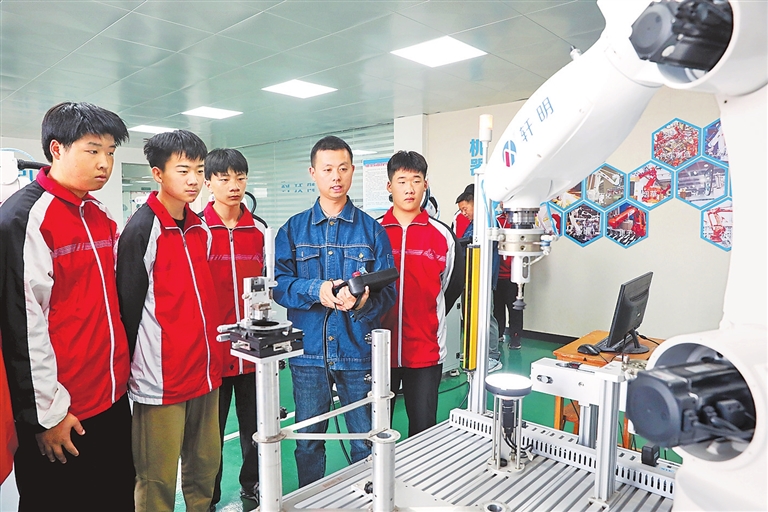 4月28日,温县职教中心机械加工专业教师在指导学生进行工业机器人实操训练。近年来,温县职教中心坚持以就业市场需求为导向,通过产教融合、校企合作、对口就业等方式,有针对性地开设新能源汽车、工业机器人、机电技术应用等专业,促进人才培养与产业链有效衔接。徐宏星 摄