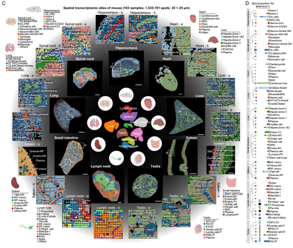 科研团队选取了2、4、13、19和25月龄的小鼠(相当于人类从青年到老年),利用时空组学技术对它们的心脏、肝脏、脾脏、肺、小肠等9个器官进行了分析,最终形成一张包含72个细胞类型的多器官衰老时空图谱。