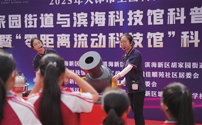 滨海科技馆则专注于以“馆街共建”模式赋能新时代青少年科技教育,打造以“大手拉小手,科学会客厅”、“零距离”流动科技馆、科普进校园助力“双减”等系列品牌,动员科技工作者、科普大使、“红领巾”志愿讲解团投身青少年科技教育,开展科普实验秀、科学原理解密、沉浸式科普体验等活动,引导培养青少年对科学的兴趣。