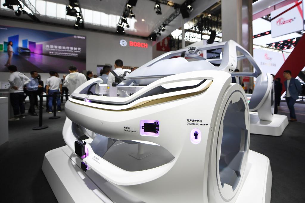在北京车展上,博世公司展台展出可用于新能源汽车智能出行解决方案的相关产品(4月25日摄)。新华社记者鞠焕宗摄