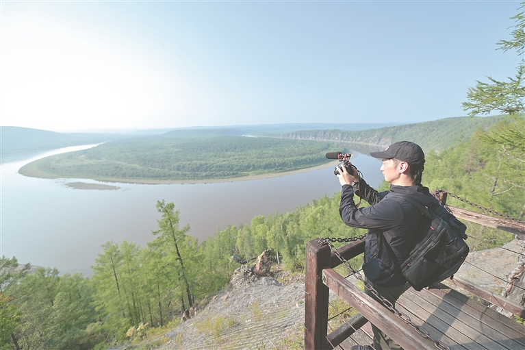 采风团记者拍摄龙江第一湾。黑龙江日报记者 张春雷摄