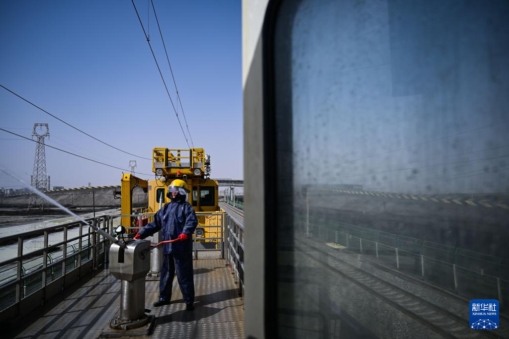 4月16日,中国铁路青藏集团有限公司西宁供电段格尔木供电车间格尔木接触网工区工作人员使用高压水枪清洗接触网绝缘子,保障青藏铁路的畅通运行。