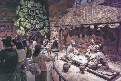 在路县故城遗址博物馆展厅内,汉代饮宴场景吸引参观者驻足。 北京日报记者 武亦彬摄