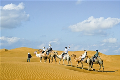 沙漠游不仅令游客很兴奋,也使牧民的心情很愉悦。独贵塔拉镇沙日召嘎查牧民吉日内的十几峰骆驼成了景区里的“宠儿”:“我们几个牧民带上自己家的骆驼在这里拉游客,已经与景区合作九年了,收入还不错。”
