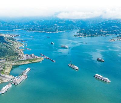 位于三峡大坝上游的宜昌市秭归县,游轮在航道上有序行驶。郑家裕摄(人民视觉)