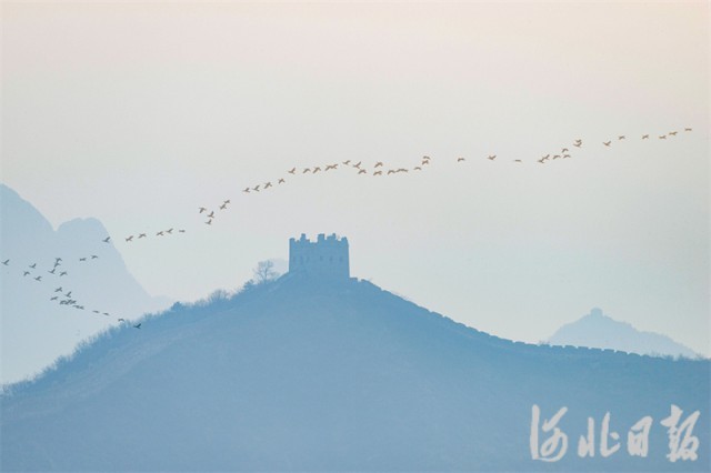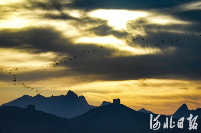 迁徙候鸟从滦平县金山岭长城上空飞过。