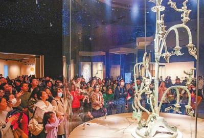 游客在三星堆博物馆参观青铜神树(资料图片)。游青摄(视觉)