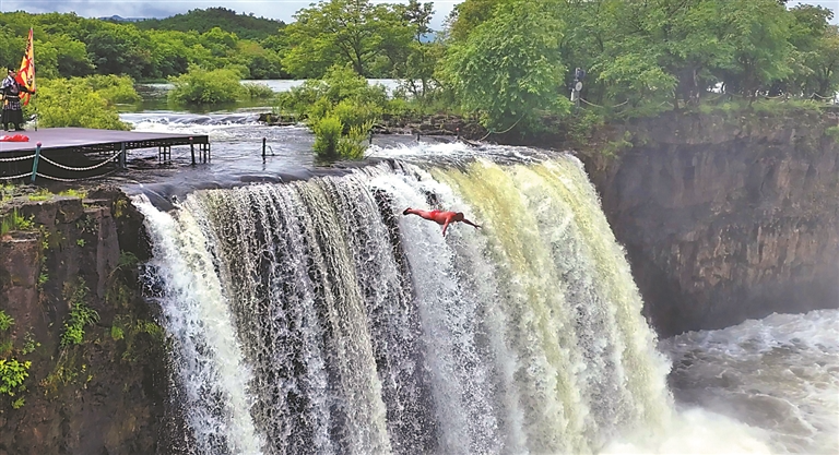 黑龙江日报讯(赵虎影 记者张雪地)“太壮观了!今天看到了水势浩大的镜泊湖三面飞瀑景色,还有精彩的跳水、演艺活动,没白来!”6月2日,游客在镜泊湖景区游览时,连连点赞。