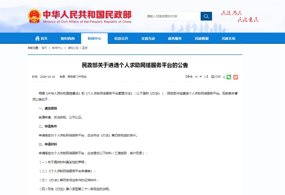 民政部10月14日就遴选个人求助网络服务平台发布公告。