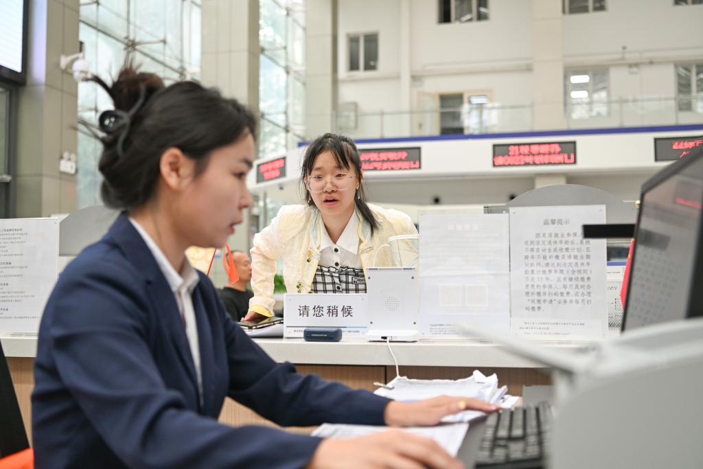 2024年8月12日,在哈尔滨新区社保综合服务大厅,工作人员(左)在办理业务。新华社记者 王松 摄