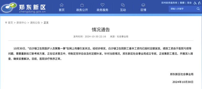 央视网消息:郑州郑东新区社会事业局10月30日晚通报,10月30日,“白沙镇卫生院医护人员聚集一事”在网上传播引发关注。经初步核实,白沙镇卫生院职工基本工资均已按时足额发放,绩效工资由于医院亏损等问题,需要重新拟订新考核方案,正在征求意见中,待制定完毕后会及时足额补发。针对当前情况,郑东新区社会事业局成立专班,正收集职工意见,开展深入调查,确保妥善解决。目前,医院诊疗秩序正常。