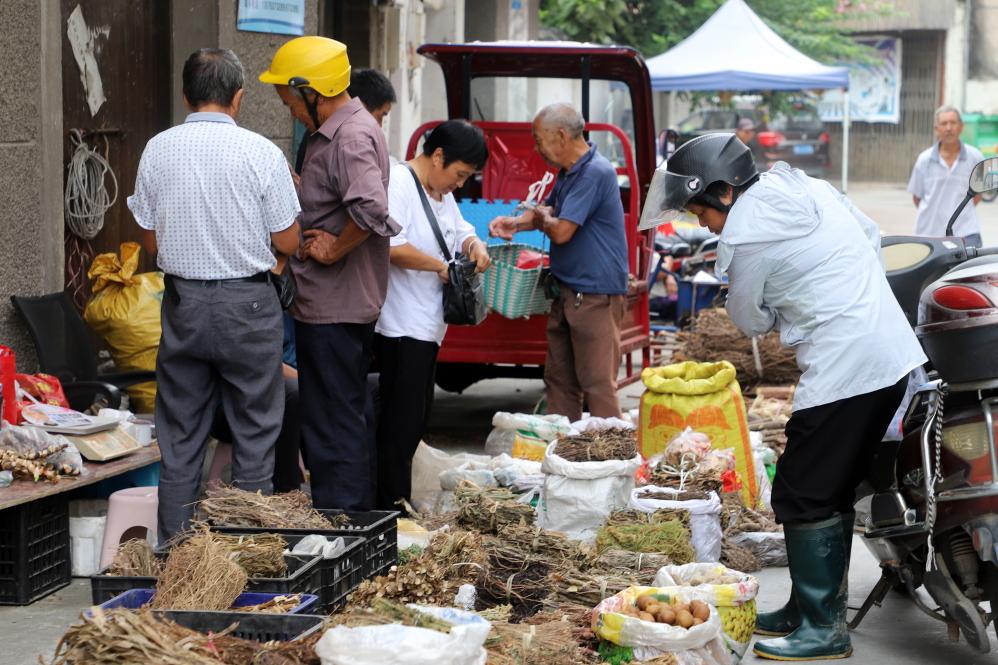 天蒙蒙亮,家住浙江丽水松阳县赤岸村的周女士骑三轮车来到松阳县古市镇万寿路街边,分类铺平摆好自己新鲜采集的中草药材。有15年赶集经验的她有信心一天卖出近1000元。