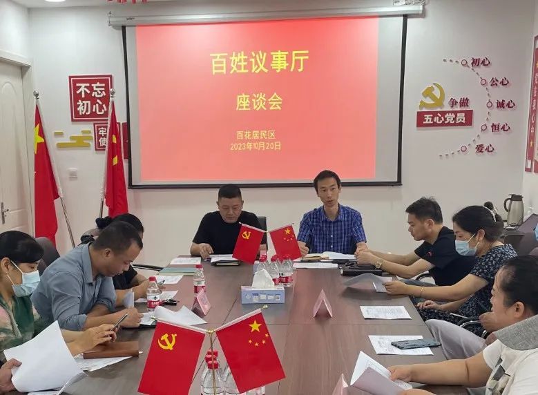 其中“百姓议事厅”作为居民议事平台,关注居民实际所需,形成了每月例会制度。百花社区组织开展居民议事座谈会,分别召集各小区的物业负责人、业委会代表、楼组长代表、居民代表以及老年干部代表,收集居民诉求,根据摸排到的居民急需解决的问题,通过居委会、物业、业委会和居民代表“多方共议”联动机制共同解决。此外,搭建“百姓议事厅”线上议事平台,实现线上线全覆盖,居民足不出户也能随时随地触网议事。