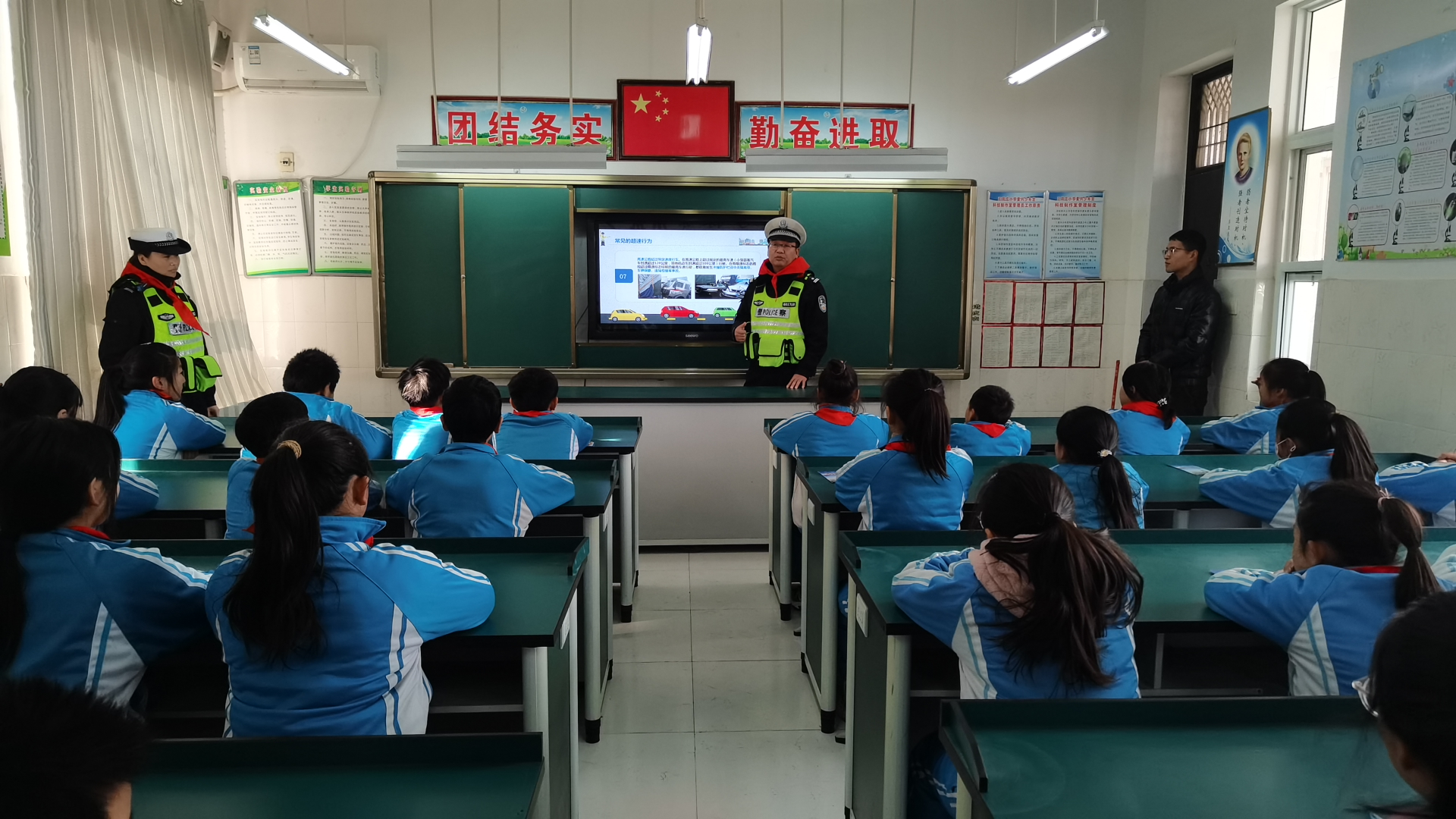 2023年11月30日上午,高速交警五支队副支队长耿卫星、民警孙珂带着宣传课件、海报展板和宣传资料来到开封市龙亭区王周庄小学进行主题宣传,民警受到了学校全体师生的热烈欢迎,四名少先队员给宣讲人员佩戴了红领巾。
