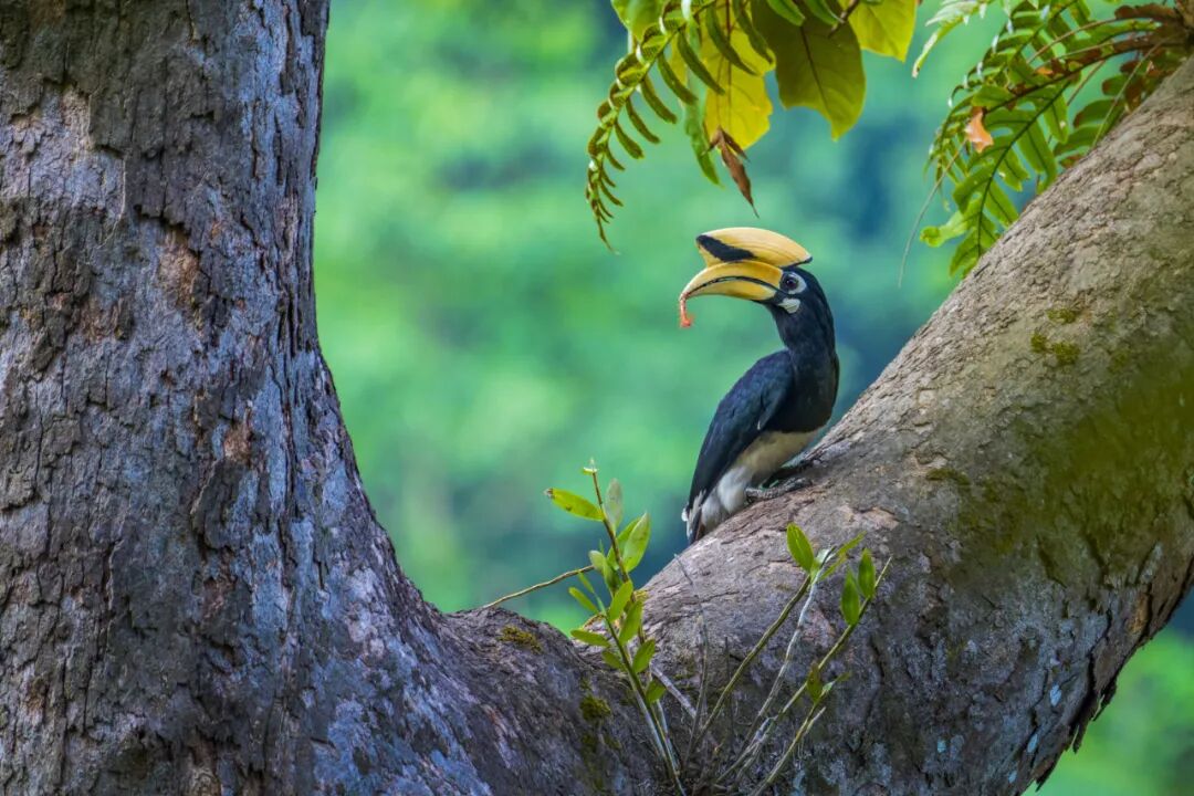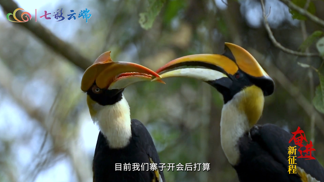 犀鸟是德宏州盈江县的旗舰物种,成鸟体长1.2米,翼展1.8米。它们形态奇特,对生态环境质量要求高,栖息在热带森林中。雌雄犀鸟结对后,遵循“一夫一妻”制,形影不离。