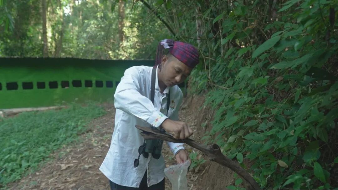每天早上8点左右,景颇族小伙木何门,都会准备好面包虫和鸟食出门,前往离家不远处的“鸟塘”喂鸟。当我们走进木何门的“鸟塘”时,正好有一只灰孔雀雉在探头探脑地等待着投喂。