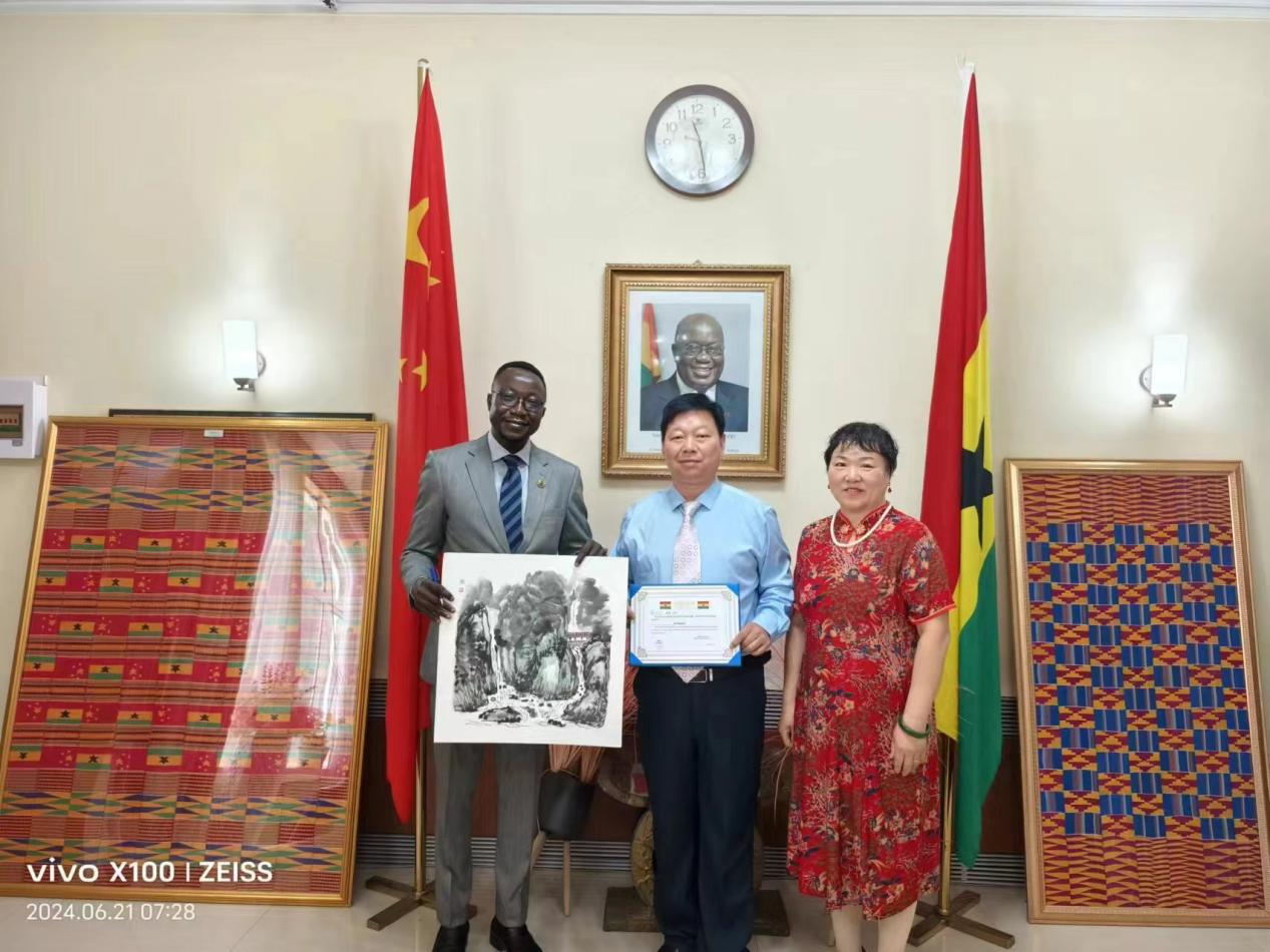 近日,中国著名画家贾运华先生应中名联国际全国名家艺术联盟邀请,走进加纳共和国驻华大使馆开展文化艺术交流活动,与大使外交官面对面进行交流。贾运华先生创作的中国山水画作品《高山流水》作为国礼赠送大使馆永久收藏。加纳驻华大使外交官阿卜杜勒阿尔哈桑亲笔签写授予贾运华先生“中非文化交流使者”荣誉证书。
