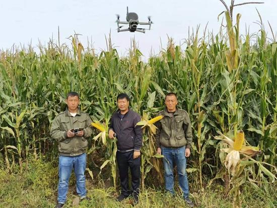 榆树市增益农业机械专业种植合作社负责人马占有和他的社员在田间调试无人机。受访者供图