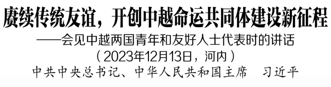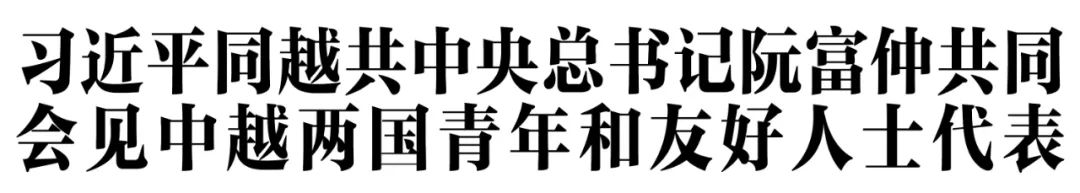 习近平和彭丽媛抵达国家会议中心时,受到越方青年代表热烈欢迎。习近平夫妇和阮富仲夫妇同中越两国青年和友好人士代表亲切合影。中越友好人士及青年见面会现场气氛热烈,鲜花和两国党旗国旗交相辉映,汇成一片喜悦的海洋。在热烈的掌声中,习近平发表题为《赓续传统友谊,开创中越命运共同体建设新征程》的重要讲话。习近平代表中国党和政府向致力于中越友好的新老朋友致以亲切问候。习近平指出,昨天,我同阮富仲总书记一道宣布构建具有战略意义的中越命运共同体,开启了中越两党两国关系发展新阶段。这是我们从振兴世界社会主义和实现中越两国长治久安出发作出的重大战略决策,深深植根于中越传统友好,符合两国人民共同利益和共同愿望。回首过去,我们志同道合、守望相助。近代以来,中越两党和两国人民坚守共同理想信念,在争取国家独立和民族解放事业进程中风雨同舟、相互支持。胡志明主席的著名诗句“越中情谊深、同志加兄弟”,成为两国人民对那段峥嵘岁月难以磨灭的历史记忆。立足当下,我们初心如磐、合作共赢。建立全面战略合作伙伴关系15年来,中越两党坚持以人民为中心,大力推进互利合作,给两国人民带来实实在在的利益。展望未来,我们前途相关、命运与共。中国正在以中国式现代化全面推进强国建设、民族复兴伟业,越南正在大力推进工业化现代化建设。中国坚定不移走和平发展道路,坚持与邻为善、以邻为伴的周边外交方针和亲诚惠容的周边外交理念,让中国式现代化更多惠及周边国家。习近平强调,中越友好的根基在人民、未来在青年。习近平对两国青年提出三点希望:一是同做中越友谊的传承者,为构建具有战略意义的中越命运共同体贡献力量。今天的中国和越南,已经用经济社会发展的显著成就,雄辩地向世界证明,双方选择的发展道路完全正确,两国加强团结合作有利于各自社会主义事业发展。希望两国各界友好人士特别是青年一代成为中越友好征程的领跑者,为实现各自国家百年奋斗征程和构建具有战略意义的中越命运共同体贡献力量。二是争当亚太振兴的参与者,为亚太地区长治久安添砖加瓦。中国改革开放和越南革新事业取得巨大成就,既是自身奋斗的结果,也得益于和平、开放、包容的亚太地区。亚太是两国安身立命之所,开放包容、合作共赢是人间正道。双方要高举亚太共同体旗帜,汇聚更多团结奋进的正能量,共同为建设和谐繁荣的亚太地区作出更大贡献。三是敢为人类进步的开拓者,为构建人类命运共同体不懈奋斗。中越两党都是胸怀天下的马克思主义政党,中越两国都是国际社会负责任的成员,应该成为推进人类进步事业的中坚力量。双方要以更广大的胸怀、更宽阔的视野担起时代责任,为维护国际公平正义发声,为推动全球发展进步出力。习近平强调,不忘来时路,方知向何行。中越两国社会主义事业发展壮大的艰辛历程和辉煌成就充分表明,加强团结合作是两国战胜前行道路上一切风险挑战、不断从胜利走向胜利的重要历史经验。我们要始终不忘初心,牢记使命,携手走好各自社会主义道路,让工业化现代化建设成果更多惠及两国人民,共同为人类进步事业作出更大贡献。阮富仲表示,在共产党领导下,越中两国在争取国家独立和民族解放事业以及社会主义建设事业中始终坚定相互支持。越中情谊深,同志加兄弟。越方始终铭记和感谢中国长期以来为越南提供的各种宝贵支持。越中全面战略合作伙伴关系建立15年来,两国政治互信日益加强,务实合作成果丰硕。这两天,河内街头巷尾到处洋溢着喜庆热烈的氛围,习近平总书记、国家主席对越南的国事访问取得了圆满成功。我同习近平总书记共同宣布构建具有战略意义的命运共同体,是越中关系的历史里程碑,必将为两国人民带来更多实在福祉,为人类和平与进步事业作出更大贡献。越中关系的未来在青年。希望两国青年深入了解并继承弘扬老一辈领导人缔结的深厚友谊,为推动越中全面战略合作伙伴关系长期稳定发展、为越中两国社会主义事业不断壮大注入新的活力。中越双方代表也汇报了两国友好交往情况。他们表示,在习近平总书记对越南进行历史性国事访问之际,两党总书记亲自拨冗会见中越友好人士和青年代表,充分体现了两国两党领导人对中越青年和友好事业的高度重视和殷切厚望。两位总书记宣布共同构建具有战略意义的命运共同体,符合两国人民共同愿望和根本利益,契合和平、合作、发展的时代潮流,必将引领中越全面战略合作伙伴关系开辟更加美好的新前景,树立周边邻国亲诚惠容的典范。两国青年将传承弘扬“同志加兄弟”的传统友谊,密切交往交流,加强互学互鉴,深化互信友谊,实现两位总书记提出的“民意基础更牢”的目标,为构建中越命运共同体作出积极努力和贡献。