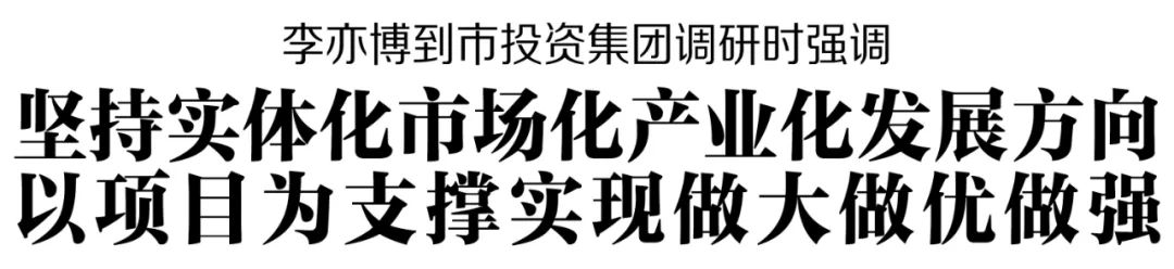 12月13日,市长李亦博专题到市投资集团调研并召开座谈会,强调要深入学习贯彻习近平总书记关于国有企业改革发展系列重要论述,坚持实体化市场化产业化发展方向,深化改革创新,强化项目支撑,不断提高发展的规模、质量和效益,为经济社会高质量发展作出新的更大贡献。详情>>