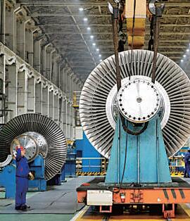 工作人员在哈电集团哈尔滨汽轮机厂有限责任公司车间内工作。新华社发