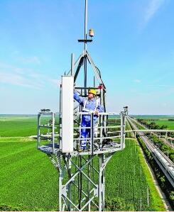 黑龙江肇东,哈齐高铁12号基站铁路通信铁塔上,技术人员在维护铁路通信设备。新华社发