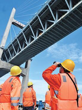 福州工务段工人在检查平潭海峡公铁大桥桥墩。新华社发