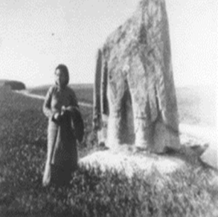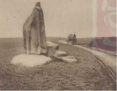 这是提醒要把这些列入保护单位。说“尚在”是有了解。《旅行杂志》登载过那雕像图片:1936年的见于网络“终南山故事”公众号;1945年的“何正璜在阿房宫遗址北朝石佛残像前留影”,见蔡昌林的博客。何是著名美术考古家,新中国任职陕西博物馆,可能与郑振铎有交流。“南北朝时期在前殿基址上曾建有大型佛寺。宋以后逐渐夷为耕地。”《中国大百科全书•文物》所记仅止于此。世纪之交某天,我雨中穿行基址上的村庄,曾匆匆拍得那立像背面。(下图)