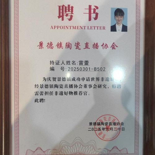 作为美国巴拿马万国博览会江西分会的秘书长,以及景德镇直播协会官方认证的“非遗推荐官”,雷蕾游刃有余地穿梭于传统与现代、中国与世界之间,用她自己的话说:“我的使命,就是为景德镇陶瓷这颗璀璨的明珠,擦去历史的尘埃,为它找到通往世界和未来的新路标。”