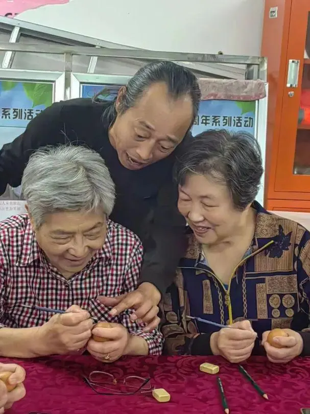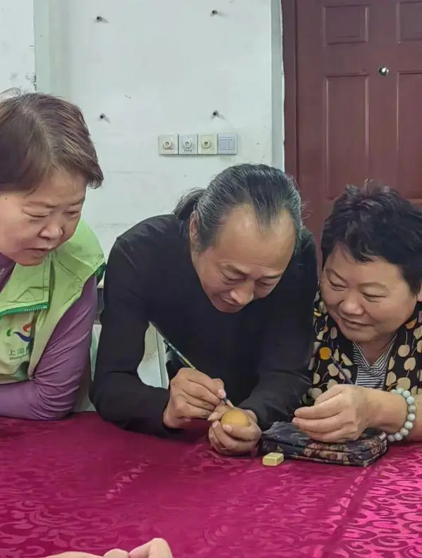 另一边,街道社区文化活动中心与区非物质文化遗产保护中心共同组织的民俗文化美育体验日活动也如火如荼开展。活动特邀“淞南蛋雕技艺”非遗传承人袁家钊老师授课。袁家钊老师自23岁开始学习蛋雕,迄今已40余年,被誉为“创造出最奇妙的指尖艺术的传承人”。