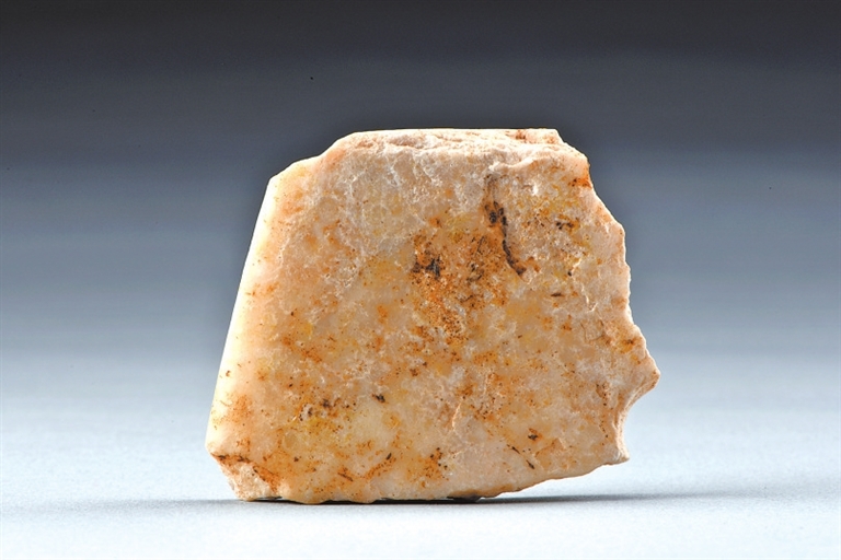 2020年仰韶村遗址第四次考古发掘出土。灰白色,方解石质地。平面形状近梯形,表面光滑平整,边缘较薄且圆润。一般认为玉钺是仰韶时期军事权力的象征,是仰韶村遗址仰韶时期的高等级遗物。