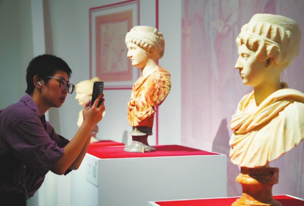 7月16日,观众在湖南博物院观赏“彼美人兮——两汉罗马时期女性文物展”。目前,“彼美人兮——两汉罗马时期女性文物展”在湖南博物院展出,展览将持续至10月7日。此次展览展品总计200余件/套,来自我国湖南博物院和意大利罗马的卡比托利欧博物馆等19家博物馆,涉及青铜器、陶器、金银器、玻璃器、玉器、雕塑等多种类别。...