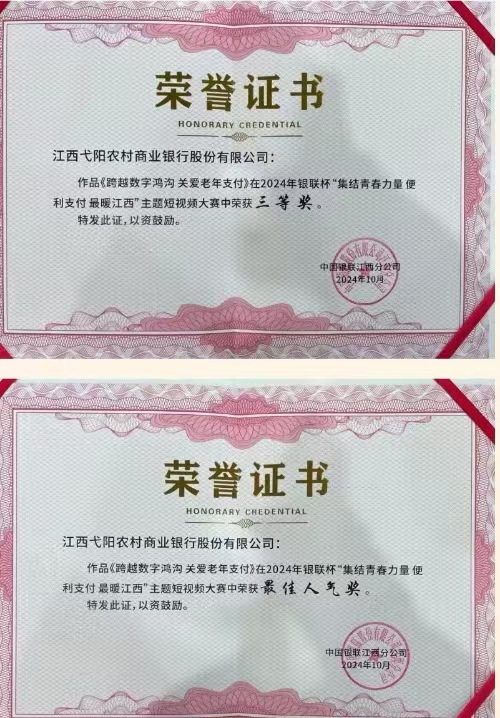 近日,在中国银联江西分公司、共青团南昌市委举办的2024年银联杯“集结青春力量 便利支付 最暖江西”主题短视频大赛票选中,弋阳农商银行参赛作品《跨越数字鸿沟 关爱老年支付》荣获三等奖与最佳人气奖。
