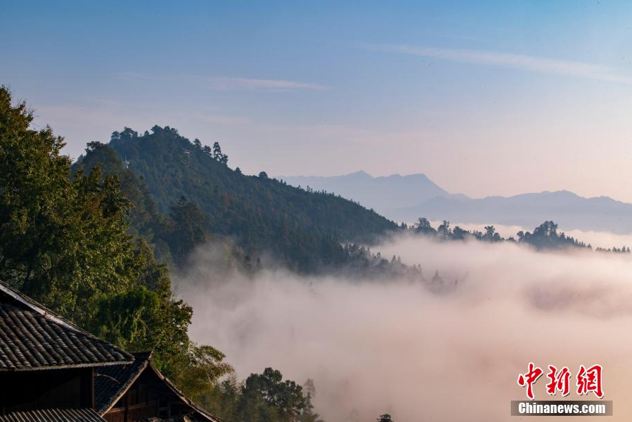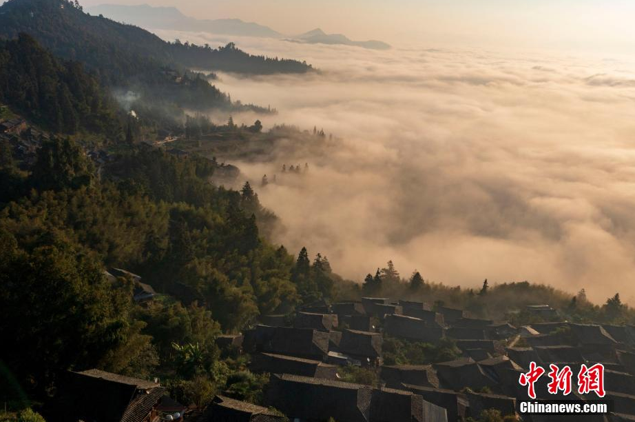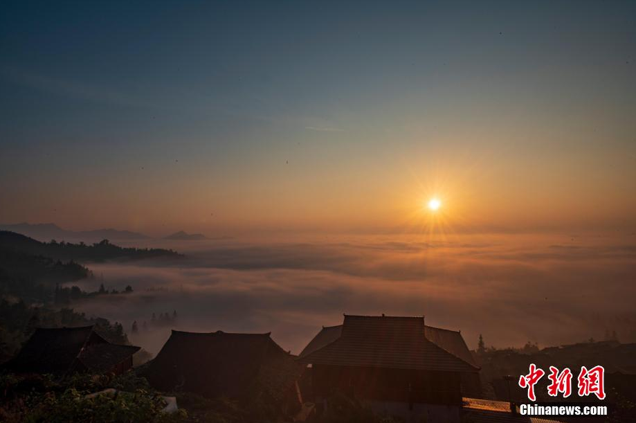 深秋时节,贵州省黔东南苗族侗族自治州从江县丙妹镇岜沙苗寨,日出晨光伴随着流动的云海,雾浪翻腾,苗族民居、山林在云海间若隐若现,宛如仙境,令人叹为观止。图为11月2日,贵州省从江县丙妹镇岜沙苗寨出现的日出云海景观。