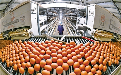 3月25日,在内蒙古绿水清山农牧科技有限公司高标准产蛋鸡舍,鲜鸡蛋通过传送带送往分装车间。据了解,该公司年产富硒鲜蛋11000吨,年实现产值1亿元,带动200余劳动力就近就业。近年来,该公司所在地赤峰市元宝山区通过政府引导和企业带动,建成集富硒鸡蛋研发、鲜蛋加工贸易、有机饲料加工、养殖技术服务为一体的蛋鸡产业链,有效拉动就业,助力乡村振兴。...
