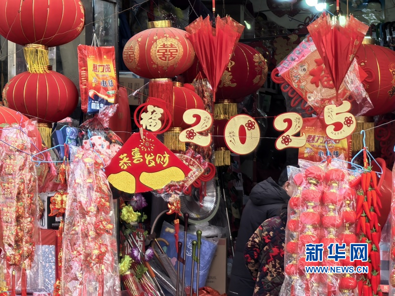 街旁的小店里,红火一片,吉祥话语的装饰品更增添了过年的喜庆氛围。