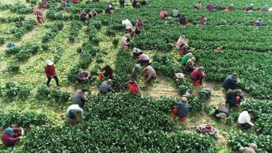 丰收现场,郁郁葱葱的菠菜长势格外喜人。400余名工人正热火朝天地忙着收获菠菜,收割、打捆、装运一系列动作娴熟流畅,一袋袋鲜嫩的菠菜被装进货车,整装待发,呈现出一派丰收景象。