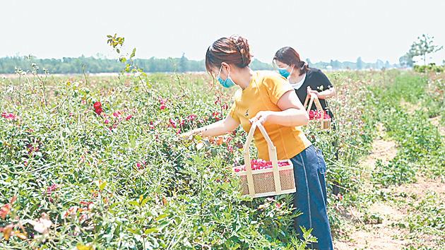 “近几年,玫瑰及其衍生品市场供不应求。为了获取高品质的玫瑰花,我们玫瑰种植基地隔几年都会换一批最新的品种。前年新种植的100余亩粉花丰花1号、红花平阴1号新品种,今年‘五一’前后,花朵盛开,我们雇了周边群众100余人来采摘,然后通过筛检、清洗、烘干等流程,将玫瑰制作成玫瑰花茶、玫瑰花酱和玫瑰花饼等产品,每亩年产值预计在6000元以上。”玫瑰文化产业园负责人介绍说,如今,玫瑰文化产业园内已建成玫瑰长廊、圆心亭等基础设施,带动农民增收致富,周边40多人常年在此务工,获得了可观的务工收入。