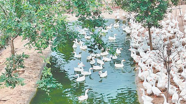大鹅在生态养殖园内嬉戏。 全媒体记者 殷允鹏 摄