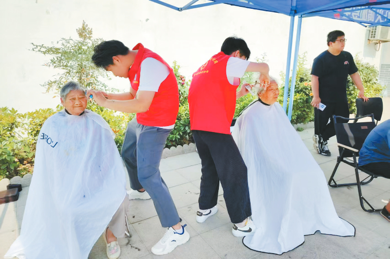 与此同时,“爱心义剪”志愿服务活动在广场一侧同步开展,学院志愿者为村民提供免费理发服务,点滴关爱传递着共建共享的温暖(如图)。