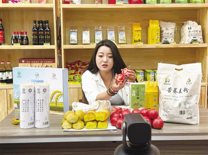5月30日,在肃州区甘味农产品展销中心,酒泉盛天农业发展有限公司主播马莉娜拿着普罗旺斯西红柿与粉丝互动。这家在肃州区农业农村局指导下成立的戈壁盛产专营店,已整合酒泉酒、冰川珍珠小米等100余款产品,构建起区域特色农产品展销平台。