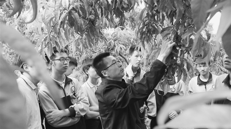 在易县桥头乡东张家庄村桃园,易县职教中心老师讲解疏果知识。 付鑫源 摄